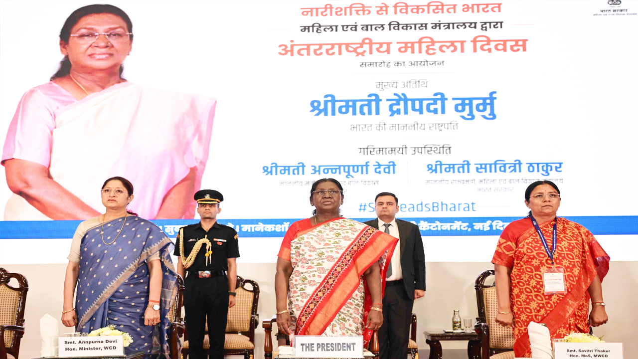 अंतर्राष्ट्रीय महिला दिवस के अवसर पर, भारत की राष्ट्रपति द्रौपदी मुर्मु ने आज (8 मार्च, 2026) नई दिल्ली में केंद्रीय महिला एवं बाल विकास मंत्रालय द्वारा आयोजित कार्यक्रम में भाग लिया और समारोह को संबोधित किया। यह राष्ट्रीय स्तर का कार्यक्रम विभिन्न क्षेत्रों में महिलाओं की उपलब्धियों और योगदानों की खुशी मनाने और लैंगिक समानता, सुरक्षा, गरिमा और महिला सशक्तिकरण के प्रति सामूहिक प्रतिबद्धता को दोहराने के लिए आयोजित किया गया।