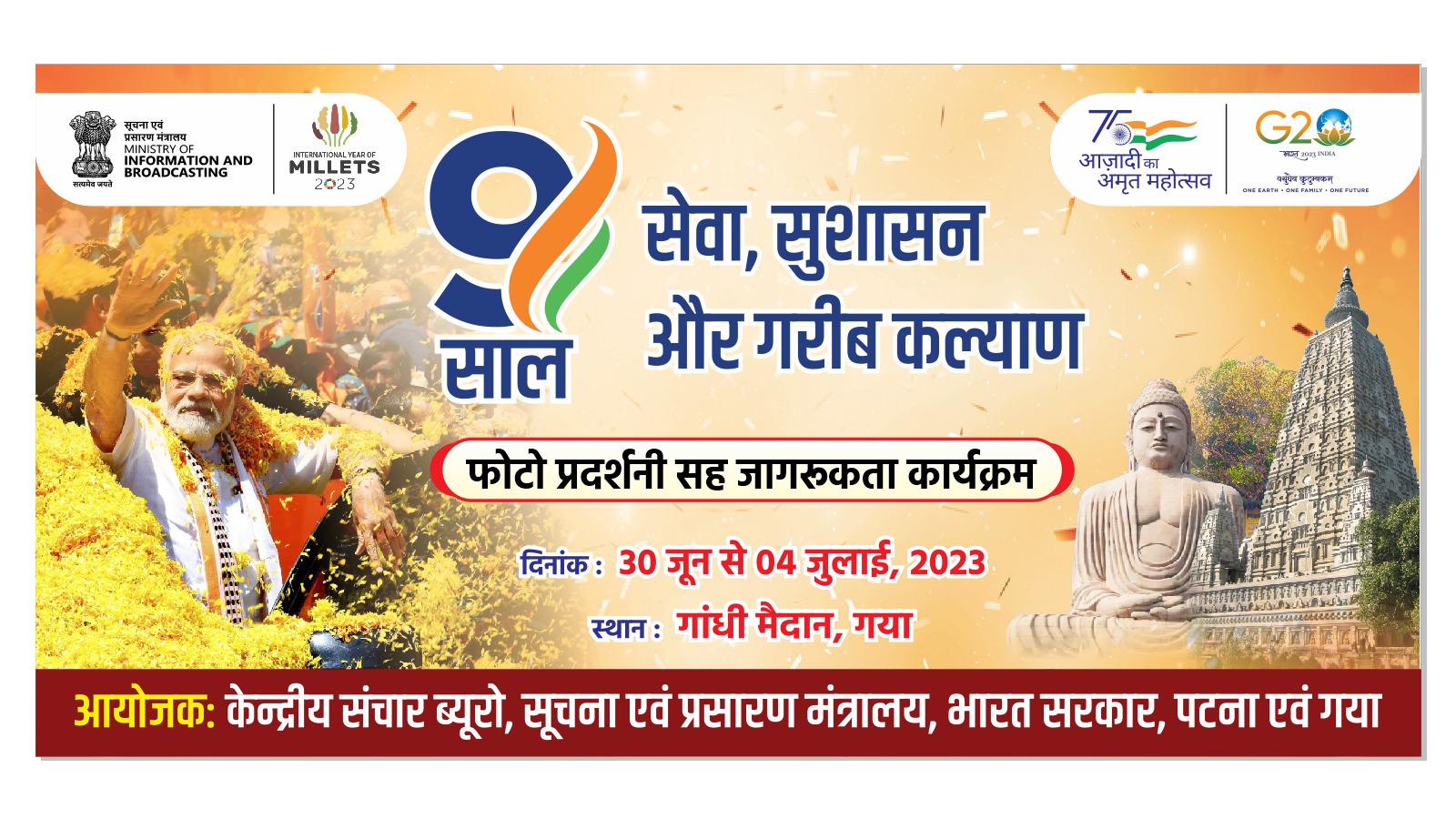 सूचना एवं प्रसारण मंत्रालय, भारत सरकार के केंद्रीय संचार ब्यूरो (सीबीसी), पटना एवं गया द्वारा गया के ऐतिहासिक गांधी मैदान में 30 जून को 10.30 बजे पांच दिवसीय नौ साल सेवा, सुशासन और गरीब कल्याण पर फोटो प्रदर्शनी सह जागरूकता कार्यक्रम का शुभारंभ किया जाएगा। कार्यक्रम का उद्घाटन बिहार सरकार के पूर्व मंत्री एवं गया के विधायक डॉ. प्रेम कुमार करेंगे।
