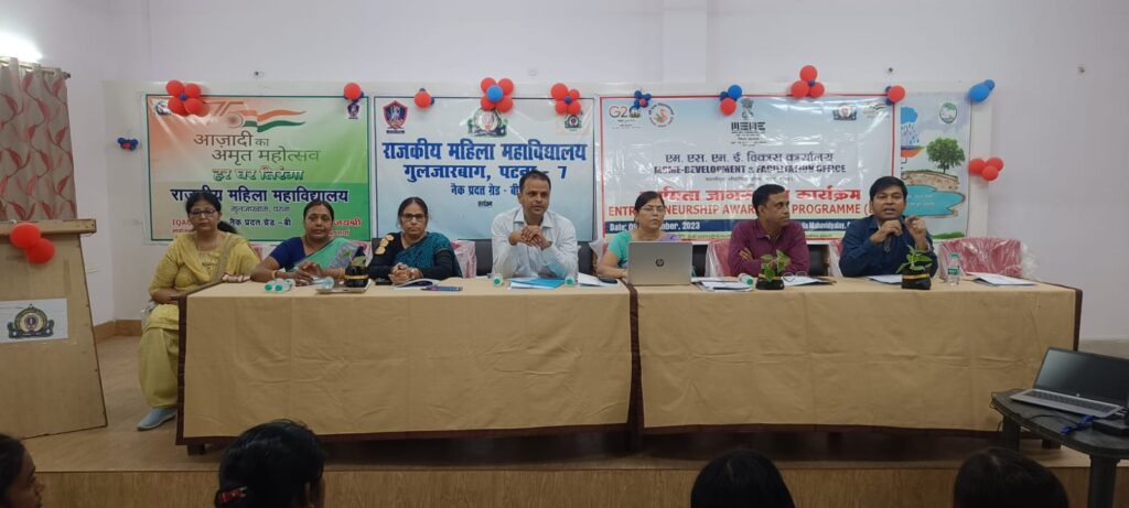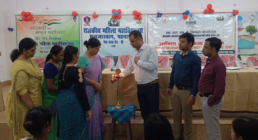 सूक्ष्म, लघु एवं मध्यम उधम विकास कार्यालय, एमएसएमई मंत्रालय, भारत सरकार,पटना द्वारा गुरुवार ( 09-11-2023) को पटना में स्थित राजकीय महिला महाविद्यालय, गुलजरबाग, पटना के सभागार में एक दिवसीय उद्यमिता जागरूकता कार्यक्रम का आयोजन किया गया जिसमें विभिन्न आयु वर्ग के प्रतिभागियों ने भाग लिया। यह कार्यक्रम , एमएसएमई मंत्रालय, भारत सरकार के उद्यमिता सह कौशल विकास योजना के अंतर्गत, इस कार्यक्रम का आयोजन कार्यालय के निदेशक महोदय प्रदीप कुमार, आई.ई.डी.एस. के निर्देशन में आयोजित किया गया। इस अवसर पर उपस्थित सभी अतिथियों द्वारा दीप प्रज्ज्वलित कर उद्घाटन किया गया।