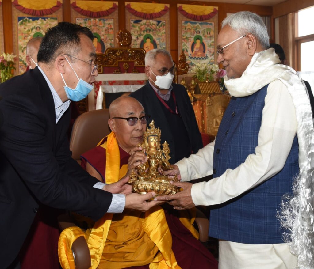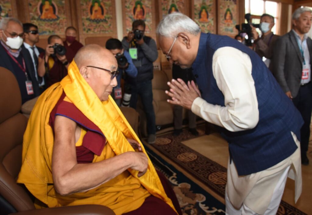 मुख्यमंत्री नीतीश कुमार आज बोधगया के तिब्बतियन मोनेस्ट्री पहुंच कर बौद्ध धर्म गुरू परम पावन दलाई लामा जी से मुलाकात की। मुख्यमंत्री ने परम पावन दलाई लामा जी को पुष्प गुच्छ, अंग वस्त्र एवं प्रतीक चिह्न भेंटकर उनका स्वागत किया और उन्हें नमन कर उनका आशीर्वाद लिया। परम पावन दलाई लामा जी ने मुख्यमंत्री को दीर्घायु एवं स्वस्थ रहने का आशीर्वाद दिया और मुख्यमंत्री ने भी परम पावन दलाई लामा जी के स्वस्थ और सुदीर्घ जीवन की कामना की। परम पावन दलाई लामा जी से बातचीत के दौरान मुख्यमंत्री ने कहा कि आप जब भी यहां आते हैं तो हम आपसे मिलने आते हैं और आपका आशीर्वाद लेते हैं। सभी धर्मों के प्रति हमलोगों का सम्मान है। बौद्ध धर्म के प्रति भी हमलोगों का सम्मान है। मुख्यमंत्री ने परम पावन दलाई लामा जी को वैशाली में बनने वाले बुद्ध सम्यक दर्शन संग्रहालय के उद्घाटन के लिए आमंत्रित किया। मुख्यमंत्री के आग्रह को परम पावन दलाई लामा जी ने स्वीकार किया।