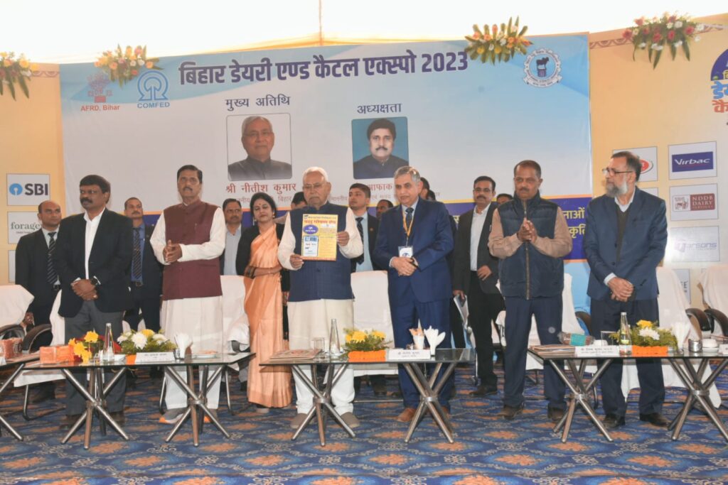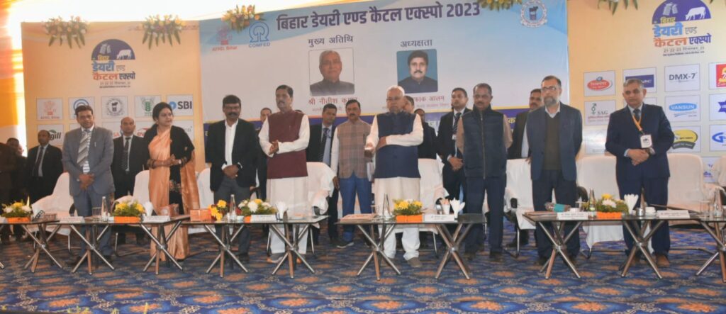 मुख्यमंत्री नीतीश कुमार ने आज तीन दिवसीय बिहार डेयरी एंड कैटल एक्सपो-2023 का दीप प्रज्ज्वलित कर विधिवत उद्घाटन किया। कार्यक्रम में मुख्यमंत्री ने रिमोट के माध्यम से शिलापट्ट का अनावरण कर 239.96 करोड़ रुपये की लागत से स्थापित कॉम्फेड, पटना के पाँच डेयरी संयंत्रों, 172.76 करोड़ रुपये की लागत से स्थापित कॉम्फेड, पटना के अन्य उपस्करों का उद्घाटन तथा पशु चिकित्सा एवं पशुपालन महाविद्यालय, किशनगंज का शुभारंभ किया। मुख्यमंत्री ने कॉम्फेड, पटना के पांच नए उत्पादों मिठाईयाँ, नमकीन, कुकीज, ब्रेड एवं पेयजल (सुधा सलिल) का लोकार्पण किया। मुख्यमंत्री ने राज्य सरकार एवं दुग्ध संघों को 10.50 करोड रुपये के लाभांश वितरण से संबंधित चेक प्रदान किया जिसमें राज्य सरकार को 5.76 करोड़ रुपये एवं दुग्ध संघ को 4.74 करोड़ रुपये वितरित किये जायेगे। बिहार वेटनरी कॉलेज, पटना के निकट स्थित परिसर में 14.31 करोड़ रुपये की लागत से कॉम्फेड के कार्यालय परिसर में निर्मित होने वाले नए कार्यालय भवन एवं मत्स्य अनुसंधान एवं प्रशिक्षण केन्द्र, मीठापुर, पटना में 54.35 करोड़ रुपये की लागत से निर्मित होने वाले मत्स्य विकास भवन का शिलान्यास किया। कॉम्फेड के कार्यालय परिसर में 3.57 करोड़ रुपये की लागत से स्थापित होनेवाली सुधा के कैफेटेरिया का शिलान्यास किया।