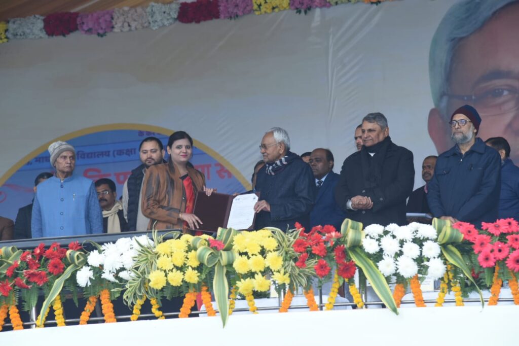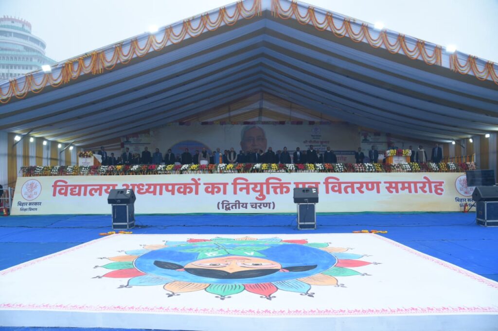 मुख्यमंत्री नीतीश कुमार ने 96,823 नवनियुक्त शिक्षकों के नियुक्ति पत्र वितरण समारोह का दीप प्रज्ज्वलित कर विधिवत शुभारंभ किया। गाँधी मैदान में आयोजित इस नियुक्ति पत्र वितरण समारोह में पटना के प्रमंडलीय आयुक्त कुमार रवि ने मुख्यमंत्री को पौधा भेंटकर उनका अभिनंदन किया। समारोह में मुख्यमंत्री के समक्ष शिक्षा विभाग की उपलब्धियों पर आधारित लघु फिल्म प्रदर्शित की गयी। मुख्यमंत्री ने उच्च माध्यमिक विद्यालय (कक्षा 11-12), माध्यमिक विद्यालय (कक्षा 9-10) एवं प्राथमिक विद्यालय (कक्षा 1-5) के कुल 96 हजार 823 नवनियुक्त शिक्षकों में से 12 शिक्षकों को सांकेतिक रूप से नियुक्ति पत्र प्रदान किया।