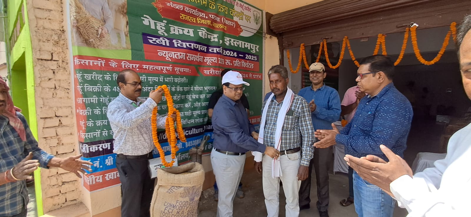 इस्लामपुर गेंहू खरीद के दौरान केंद्र पर मुख्यालय नई दिल्ली से अजित कुमार सिन्हा, कार्यकारी निदेशक,रवि सिन्हा, उप महाप्रबंधक तथा बिहार क्षेत्र के महाप्रबंधक अमित भूषण सहित, मण्डल प्रबंधक पटना श्री कुमार अभिषेक, सहायक महाप्रबंधक श्री सुनील कुमार एवं अन्य पदाधिकारी उपस्थित रहे | अमित भूषण, महाप्रबंधक बिहार क्षेत्र ने बाताया कि इस वर्ष गैंहू खरीद हेतु भारतीय खाद्य निगम द्वारा 150 गेहूँ खरीद केंद्र पूरे बिहार मे में खोले हैं जिन पर गेंहू खरीद का कार्य शुरू हो चुका है । हमारे सभी केंद्रों पर किसानों के पंजीकरण की निशुल्क व्यवस्था है और किसान कहीं भी पंजीकरण करवा सकते है | उन्होंने कहा कि किसान भाइयों से अनुरोध है कि नजदीकी खरीद केंद्र पर गेंहू बेचने के लिए अपना पंजीकरण कृषि विभाग के पोर्टल पर करवाएं तथा सहकारिता विभाग के ऑनलाइन पोर्टल पर आवेदन करें | सहायता के लिए निशुल्क हेल्पलाइन पर संपर्क कर सकते हैं। बिहार राज्य में 5000 से अधिक केंद्र कार्यरत है जिनपर पैक्स, व्यापर मंडल, नैफेड, एन सी सी ऍफ़ तथा भारतीय खाद्य निगम द्वारा खरीद की जा रही है और खरीद से लेकर भुगतान तक की पूरी प्रक्रिया पारदर्शिता के साथ ऑनलाइन माध्यम से ही की जा रही है | किसानों से अनुरोध हे गेंहू को औने पौने दाम में बेचने के बजाय संसथागत सरकारी गेंहूं खरीद केन्द्रों पर समर्थन मूल्य पर ही विक्रय करें क्योंकि यह खरीद गया अनाज बिहार के लाभार्थियों को ही विभिन्न जन वितरण योजनाओं के माध्यम से वितरण होना है |