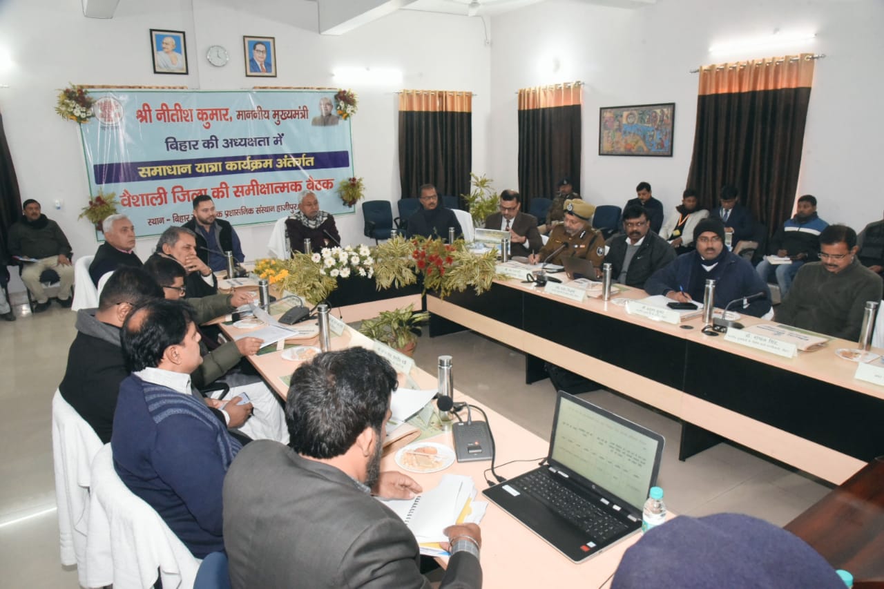 मुख्यमंत्री नीतीश कुमार ने समाधान यात्रा के क्रम में वैशाली जिले में विभिन्न विभागों द्वारा चलाए जा रहे विकास कार्यों की प्रगति के संबंध में बिहार सुधारात्मक प्रशासनिक संस्थान, कॉन्फ्रेंस हॉल, हाजीपुर में समीक्षात्मक बैठक की। बैठक में वैशाली जिले के सांसद / विधायक / विधान पार्षदगण तथा विभिन्न विभागों के अपर मुख्य सचिव / प्रधान सचिव / सचिव शामिल बैठक में वैशाली जिले के जिलाधिकारी श्री यशपाल मीणा ने प्रस्तुतीकरण के माध्यम से हुए। वैशाली जिले में विभिन्न विभागों के माध्यम से चल रहे विकास योजनाओं के संबंध में विस्तृत जानकारी दी। उन्होंने हर घर नल का जल, हर घर तक पक्की गली-नालियां, बिहार स्टूडेंट क्रेडिट कार्ड योजना, स्वयं सहायता भत्ता, कुशल युवा कार्यक्रम, सात निश्चय -1 के तहत जिले में निर्माण किए जाने वाले भवनों की स्थिति, पॉलिटेक्निक संस्थानों के सेंटर ऑफ एक्सीलेंस की स्थापना, औद्योगिक प्रशिक्षण संस्थान में सेंटर ऑफ एक्सीलेंस की स्थापना, मत्स्य संसाधन का विकास, मुख्यमंत्री उद्यमी योजना, अनुसूचित जाति एवं अनुसूचित जनजाति के शैक्षणिक उत्थान के लिए आवासीय विद्यालय, मुख्यमंत्री अनुसूचित जाति एवं अनुसूचित जनजाति छात्रावास अनुदान योजना, जीविका समूह का गठन, मुख्यमंत्री कन्या उत्थान योजना, उच्चतर शिक्षा हेतु महिलाओं को प्रोत्साहन, अल्पसंख्यक छात्रावास योजना, अल्पसंख्यक मुस्लिम परित्यक्ता/तलाकशुदा महिला सहायता योजना, मुख्यमंत्री अल्पसंख्यक रोजगार ऋण योजना, मुख्यमंत्री पिछड़ा वर्ग व अत्यंत पिछड़ा वर्ग छात्रावास योजना, अन्य पिछड़ा वर्ग कल्याण छात्रावास योजना, जननायक कर्पूरी ठाकुर छात्रावास योजना सहित अन्य योजनाओं के संबंध में जानकारी दी।